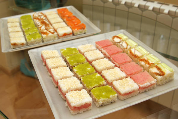 Осидзуси (押し寿司: прессованное суши). Суши в виде брусочков, сделанное с помощью деревянного приспособления, называемого осибако. Повар укладывает начинку на дно осибако, покрывает её рисом и сжимает пресс до получения плотного прямоугольного бруска. Затем брусок вытаскивается из осибако и нарезается на небольшие кусочки, которые целиком помещаются в рот.