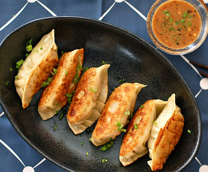 Гёдза – очень популярное блюдо в Японии. Изначально так называли китайские жареные пельмени цзяоцзы. Есть множество разновидностей гёдза: яки-гёдза (жареные в небольшом количестве масла), агэ-гёдза (во фритюре), суй-гёдза (вареные), муси-гёдза (на пару) и эби-гёдза (с начинкой из рубленных креветок). В состав фарша практически всех гёдза входят овощи, лук, чеснок.